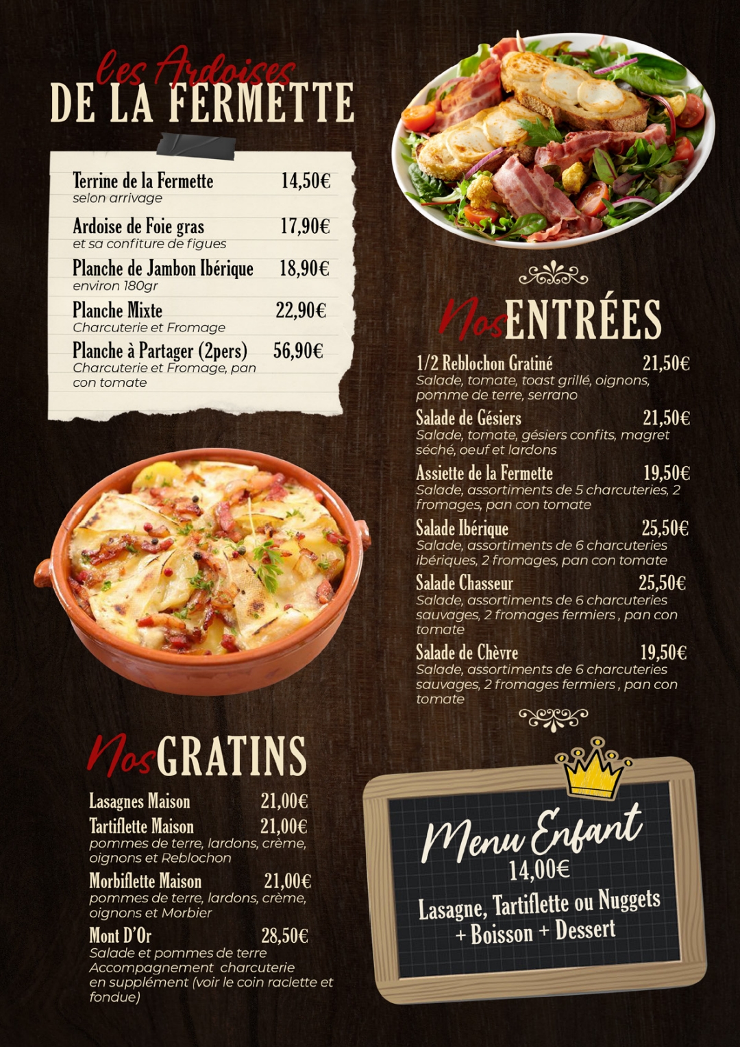 À La Fermette de Font-Romeu, notre menu est une déclaration d’amour aux montagnes des Pyrénées. Nous mettons un point d’honneur à sélectionner des produits locaux de la plus haute qualité, des fromages artisanaux aux charcuteries traditionnelles, en passant par des viandes exceptionnelles. Chaque plat est une célébration des saveurs montagnardes, un hommage à la richesse du terroir local.